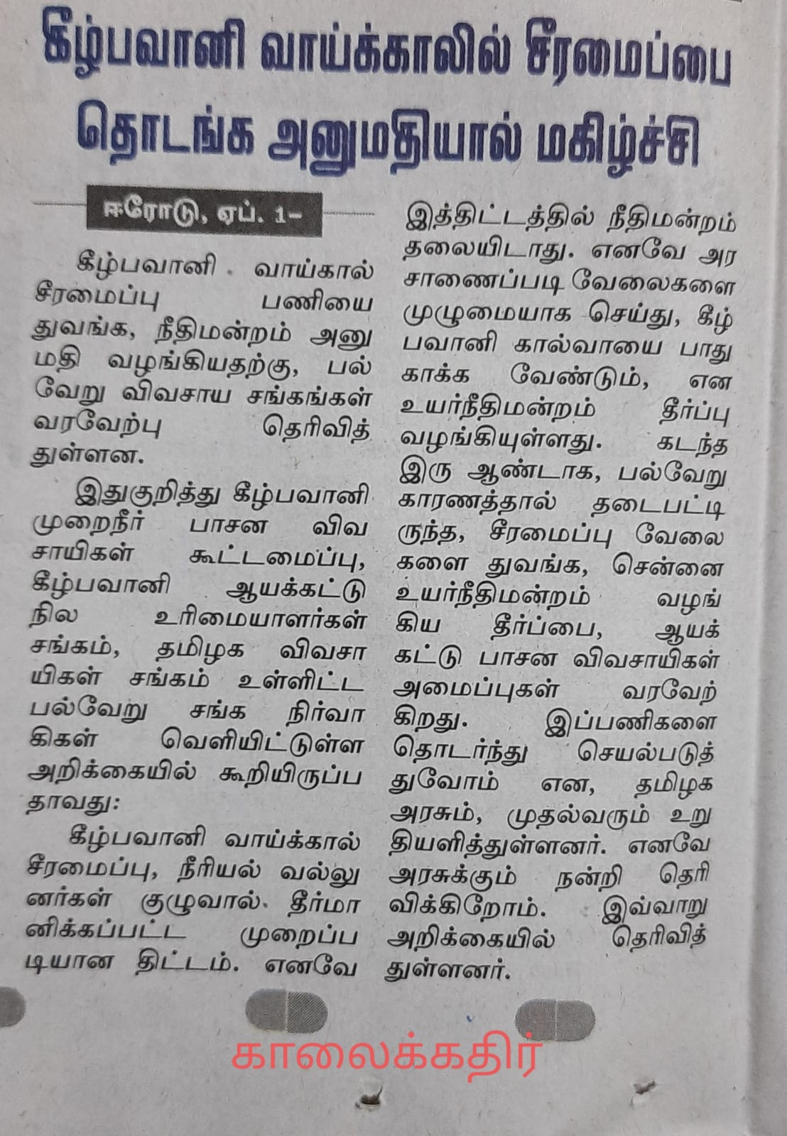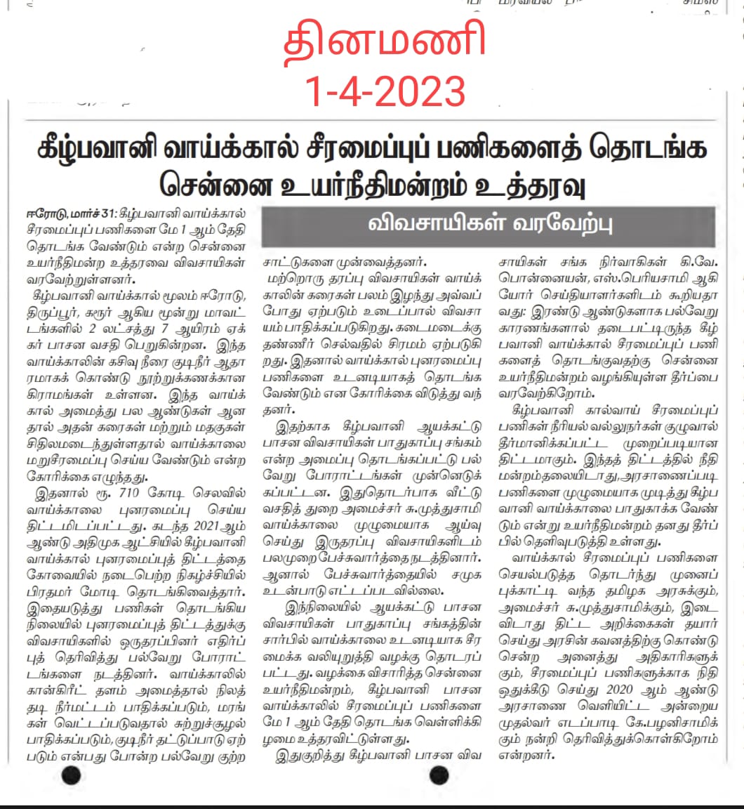 கீழ் பவானி கால்வாய் சீரமைப்பு வேலைகளை 2023 மே 1ஆம் தேதி முதல் தொடங்க வேண்டும் என்று இன்று ( 31/03/2023 )தமிழக அரசுக்கு சென்னை உயர்நீதிமன்றத்தின் தலைமை நீதிபதி அமர்வு ஆணை!