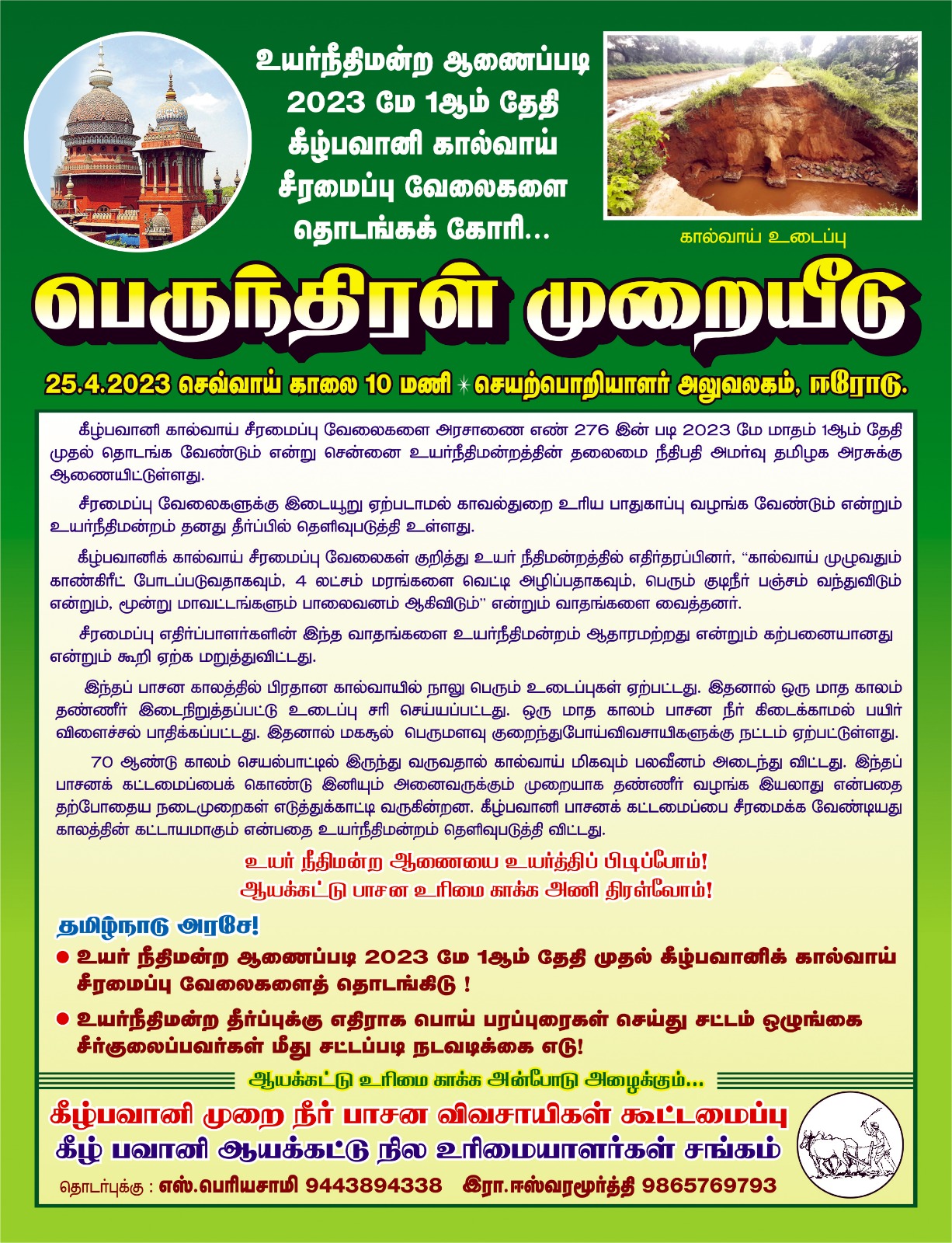 2) ஏப்ரல் -25ஆம் தேதி செவ்வாய்க்கிழமை ஈரோடு செயற்பொறியாளர் அலுவலகத்தில் உயர்நீதிமன்ற மே -1ஆம் தேதி சீரமைப்பு வேலைகளை தொடங்க வேண்டிஆயக்கட்டு விவசாயிகள் பெரும் திரளாக முறையீடு செய்வது என்று முடிவு செய்யப்பட்டுள்ளது