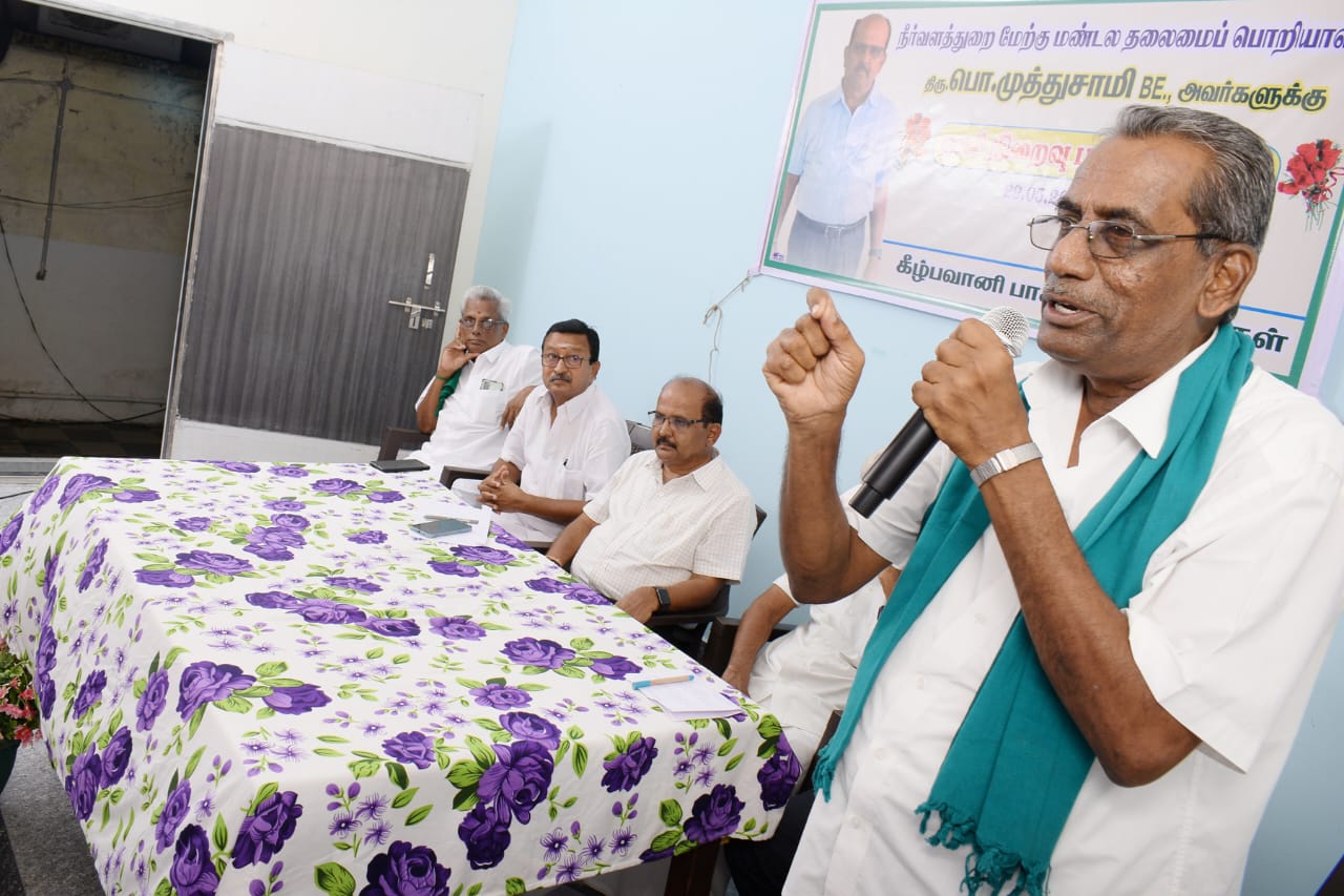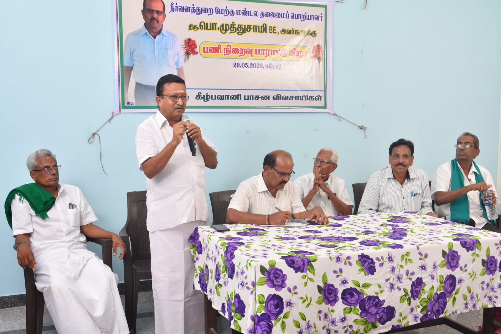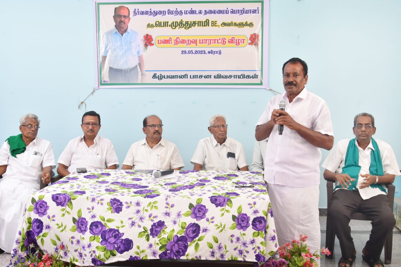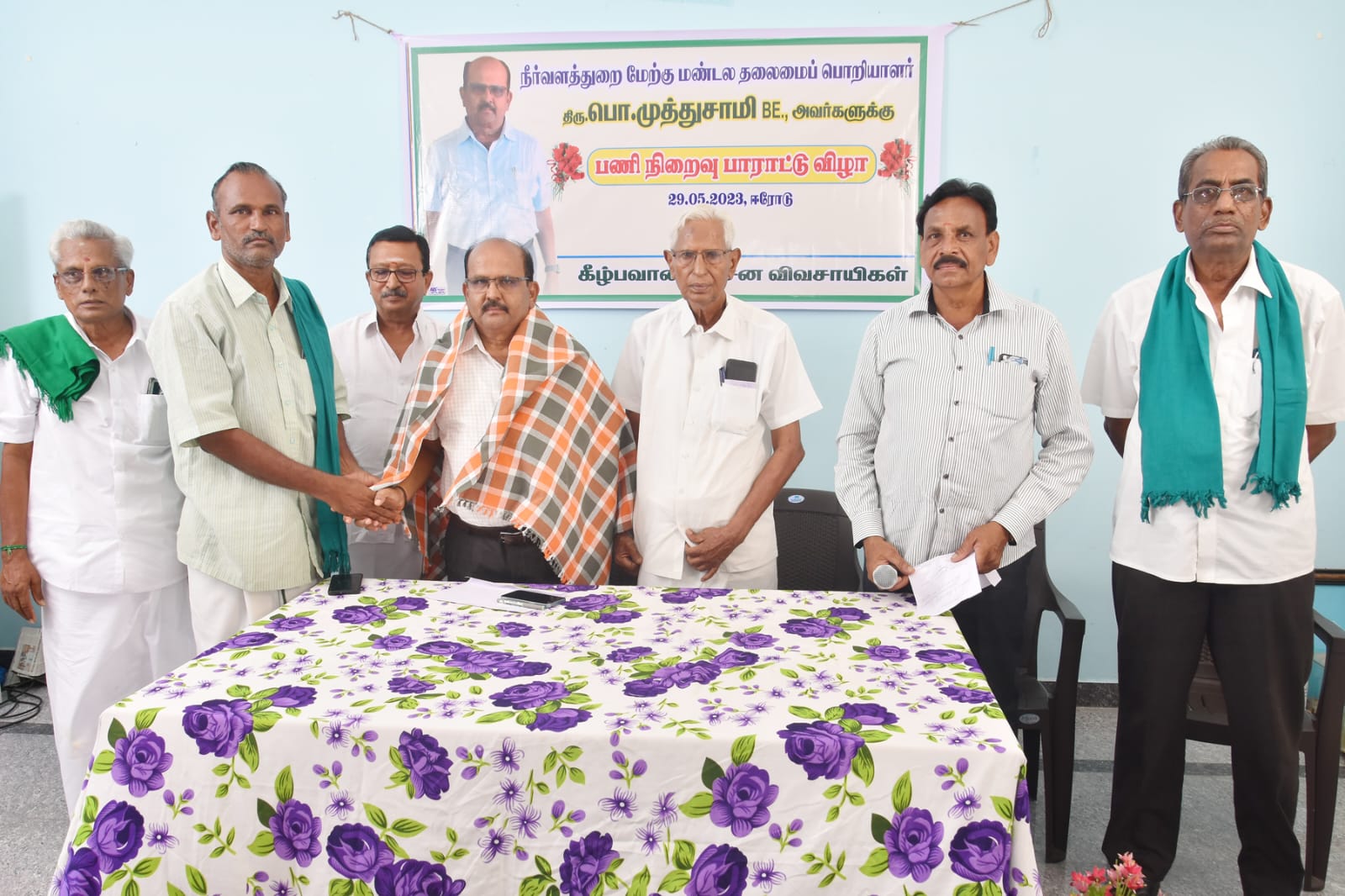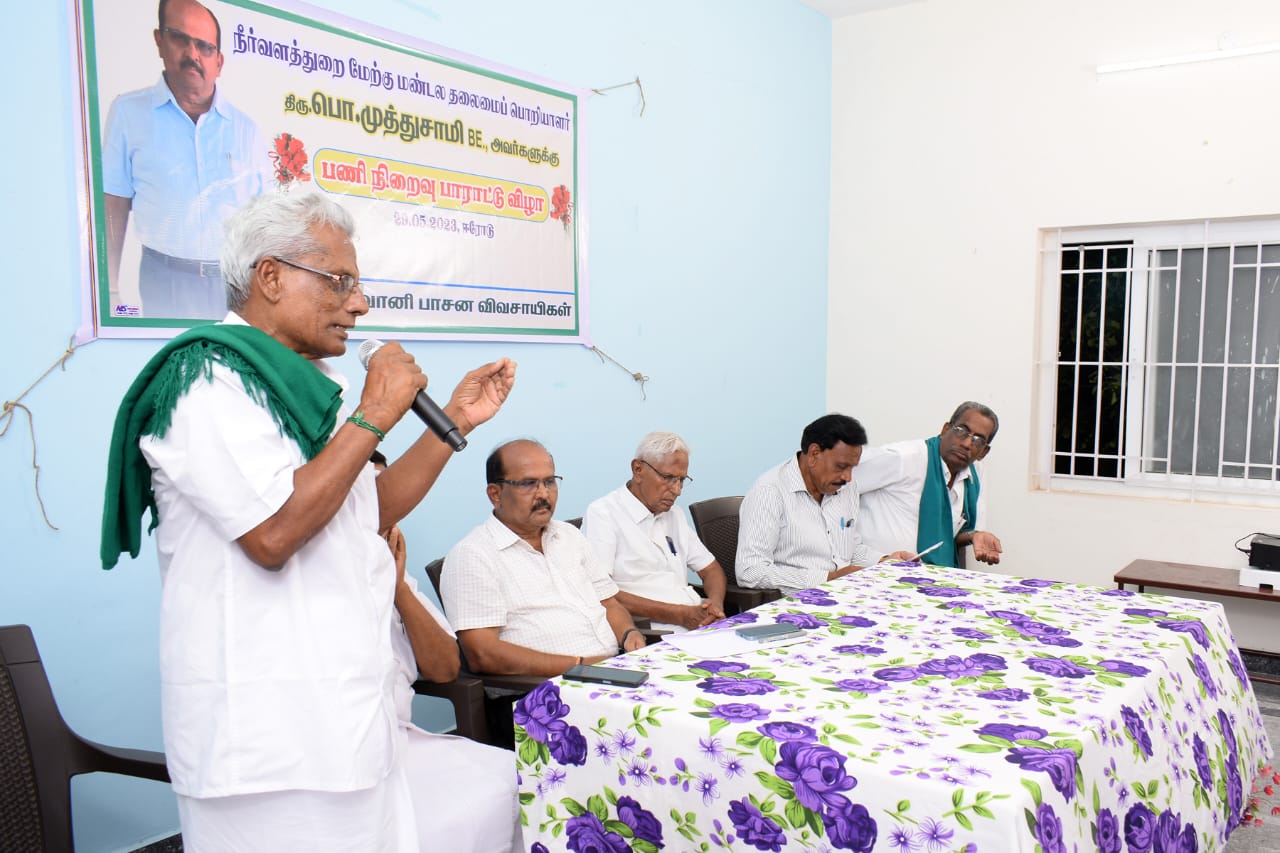 முத்துசாமி அவர்கள் பணி நிறைவு செய்தாலும் அவருடைய நீர் மேலாண்மை அறிவையும், ஆற்றலையும் அந்தத் துறையும் பயன்படுத்த வேண்டும் :உழவர் இயக்கங்களும் பயன்படுத்த வேண்டும் . பயன்படுத்துவோம் என்ற கோரிக்கையை அவரிடம் நேற்று அனைவரும் முன் வைத்துள்ளோம். பணி நிறைவு பெற்று விடைபெறும் மேற்கு மண்டல பொறிஞர் முத்துசாமி அவர்களைப் பாராட்டுகிறோம், வாழ்த்துகிறோம். அவர் ஆற்றிய பெரும் கடமைக்கு நன்றி பகர்கிறோம்.