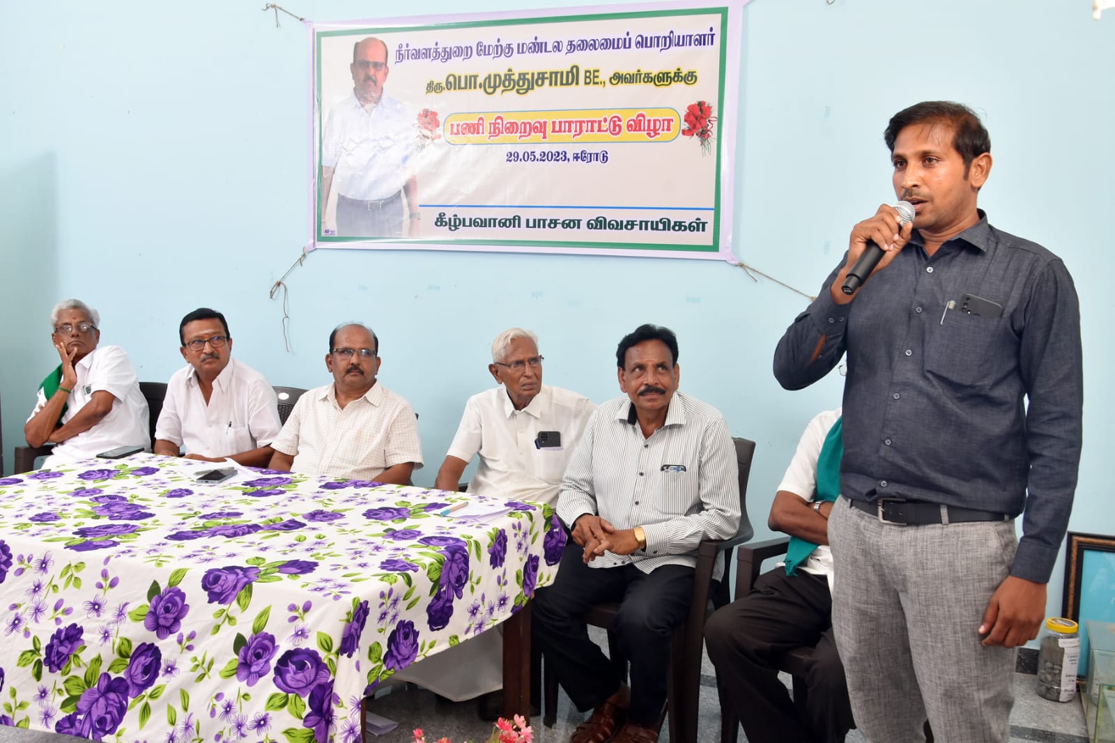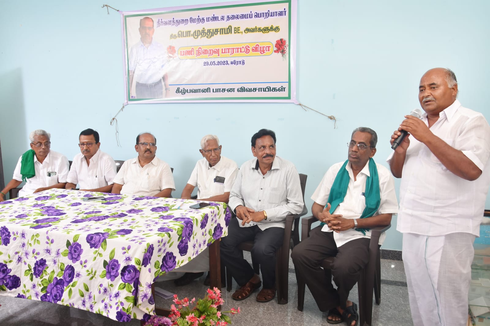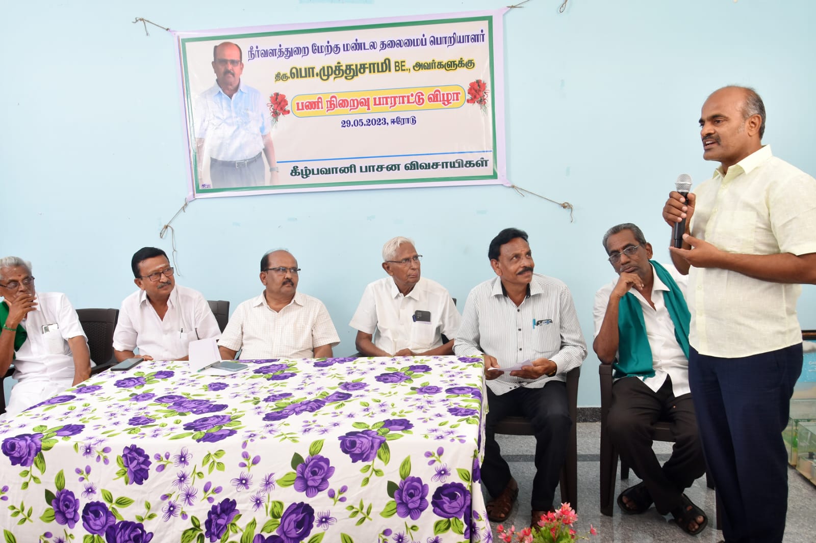 கி.வே.பொன்னையன் செயலாளர் கீ.ப.ஆ.நி.உ.சங்கம். எம்.வி.சண்முகராஜ் தலைவர்.புகழூர் பாரி சர்க்கரை ஆலை கரும்பு விவசாயிகள் சங்கம் பாபு. பாசன சபை பா.ம.வெங்கடாசலபதி இணைச்செயலாளர் கூட்டமைப்பு. பொறியாளர் சங்கம் சார்பில் உதயக்குமார் உதவி செயற் பொறியாளர் நன்றி உரை: சாலைப் புதூர் பெரியசாமி இணைச்செயலாளர் கூட்டமைப்பு . L15,L14,L13,L10,L9,L8,L5,L3,L2,M7,M1 ஆகிய பாசன சபையின் நிர்வாகிகள் கலந்துகொண்டனர். நிகழ்வு அனைத்தையும் தோழர் பாலு அவர்கள் பதிவு செய்ததோடு வாழ்த்து மடலையும் கலை நயத்தோடு அணியப்படுத்தி கொடுத்திருந்தார். ஒரு அரசு பணியாளர் தனது பணிக்காலத்தில் செய்கின்ற வேலைகளை சமூகம் எவ்வாறு மதிப்பீடு செய்கிறது என்பதை ஈரோட்டில் நடந்த பணி நிறைவு பாராட்டு நிகழ்வு எடுத்துக்காட்டியது.