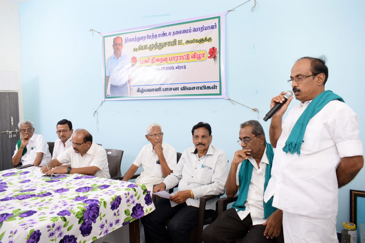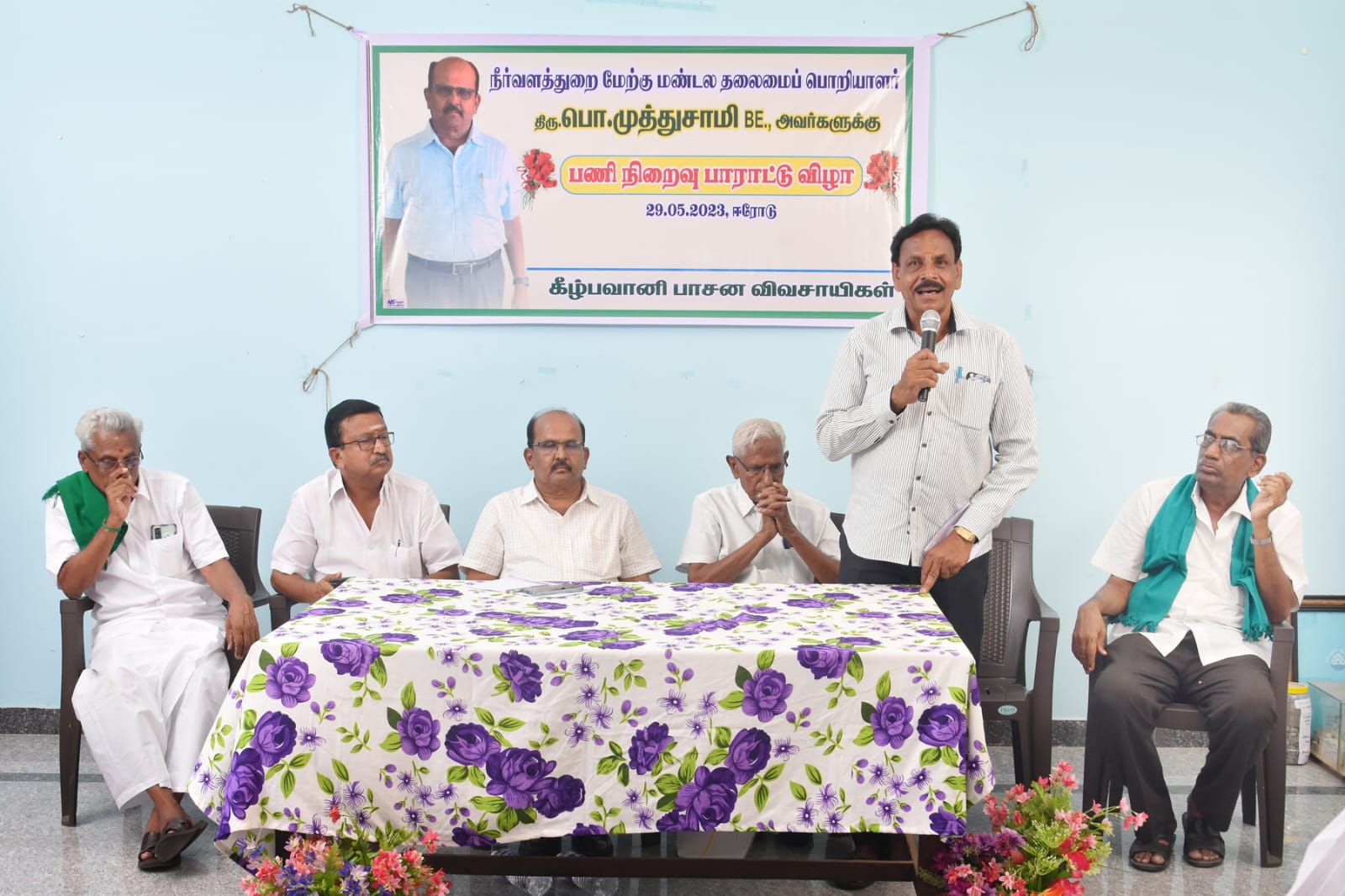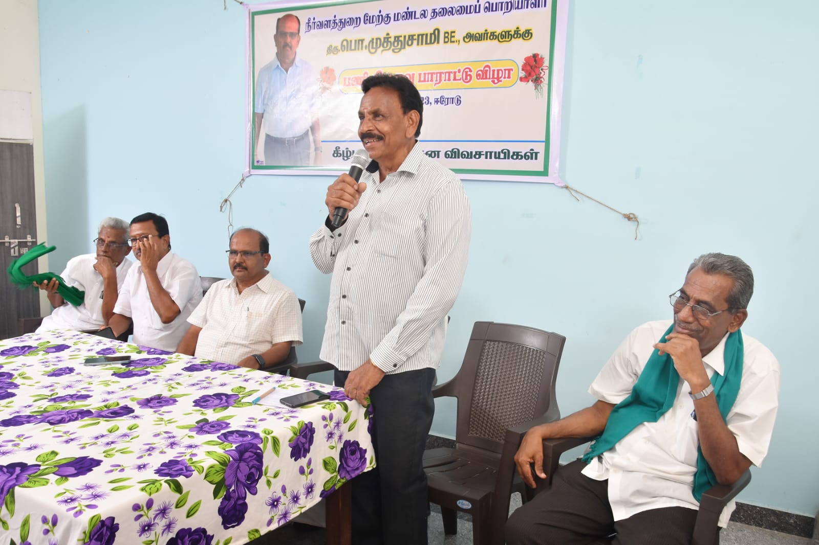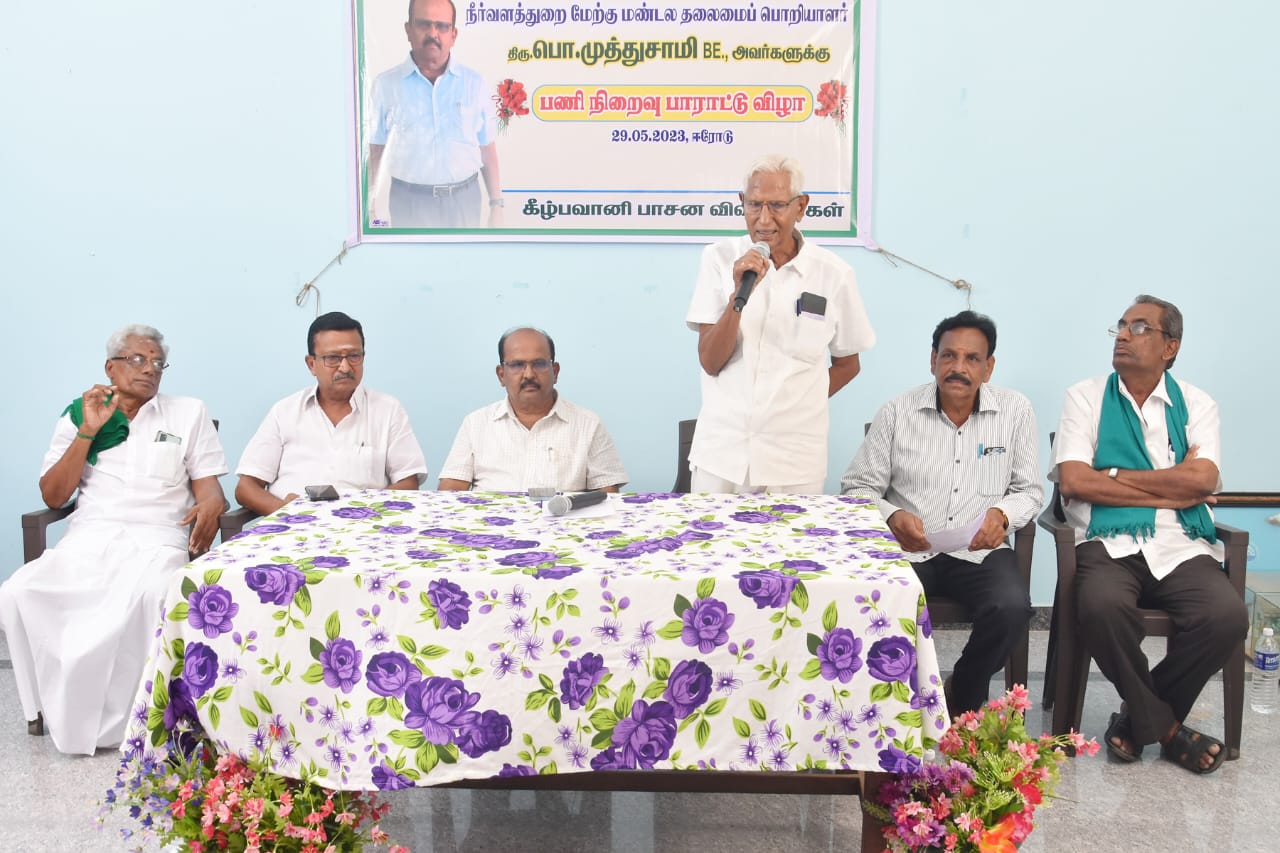 கி.வே.பொன்னையன் செயலாளர் கீ.ப.ஆ.நி.உ.சங்கம். எம்.வி.சண்முகராஜ் தலைவர்.புகழூர் பாரி சர்க்கரை ஆலை கரும்பு விவசாயிகள் சங்கம் பாபு. பாசன சபை பா.ம.வெங்கடாசலபதி இணைச்செயலாளர் கூட்டமைப்பு. பொறியாளர் சங்கம் சார்பில் உதயக்குமார் உதவி செயற் பொறியாளர் நன்றி உரை: சாலைப் புதூர் பெரியசாமி இணைச்செயலாளர் கூட்டமைப்பு . L15,L14,L13,L10,L9,L8,L5,L3,L2,M7,M1 ஆகிய பாசன சபையின் நிர்வாகிகள் கலந்துகொண்டனர். நிகழ்வு அனைத்தையும் தோழர் பாலு அவர்கள் பதிவு செய்ததோடு வாழ்த்து மடலையும் கலை நயத்தோடு அணியப்படுத்தி கொடுத்திருந்தார். ஒரு அரசு பணியாளர் தனது பணிக்காலத்தில் செய்கின்ற வேலைகளை சமூகம் எவ்வாறு மதிப்பீடு செய்கிறது என்பதை ஈரோட்டில் நடந்த பணி நிறைவு பாராட்டு நிகழ்வு எடுத்துக்காட்டியது.