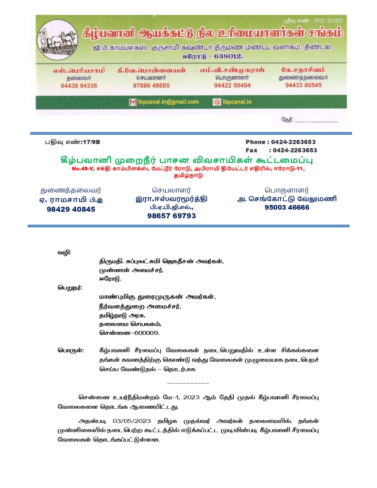தமிழக முதல்வருக்கு மாவட்ட ஆட்சியர் மூலம் மனு 05/12/23 அன்று ஈரோடு மாவட்ட ஆட்சியர் அலுவலகத்தில் கீழ் பவானி பாசனத்தில் இன்னொரு பாதிக்கு தண்ணீர் விட வேண்டும் எ...
