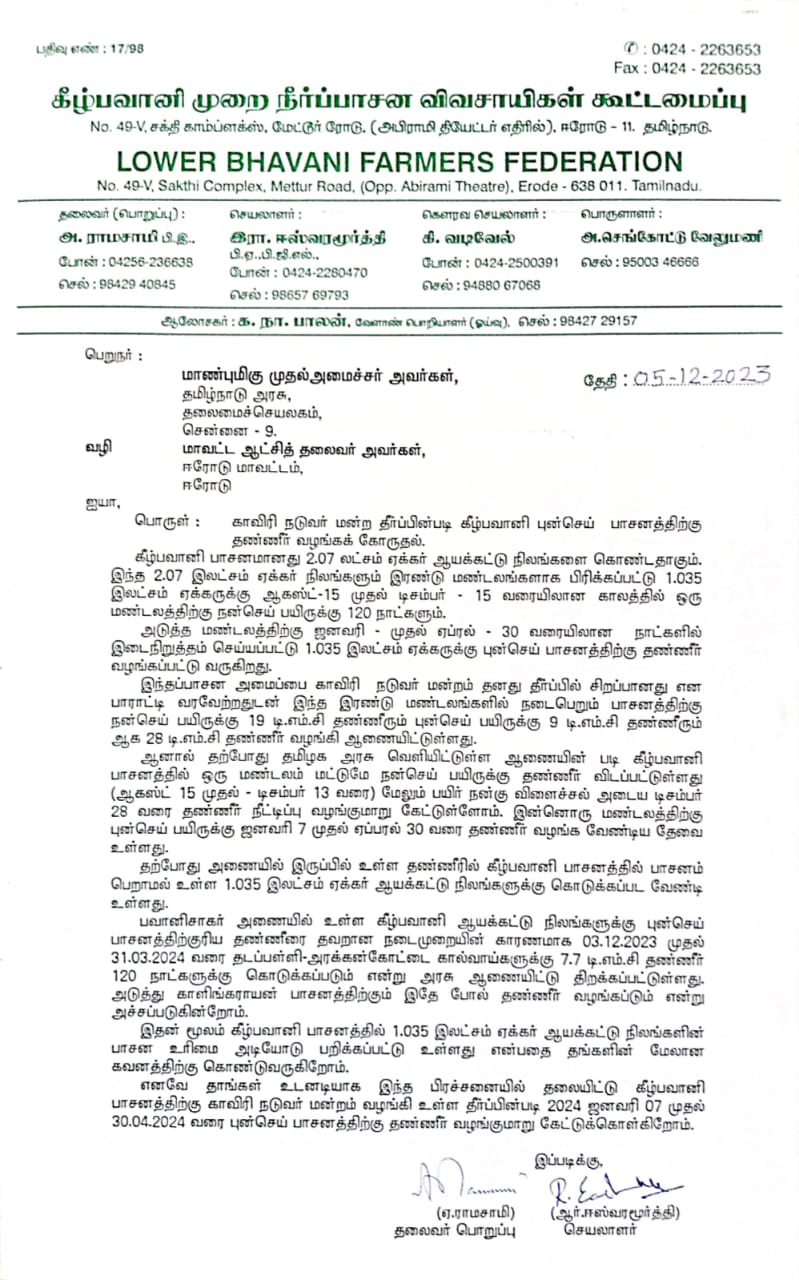 05/12/23 அன்று ஈரோடு மாவட்ட ஆட்சியர் அலுவலகத்தில் கீழ் பவானி பாசனத்தில் இன்னொரு பாதிக்கு தண்ணீர் விட வேண்டும் என்ற உரிமையை வலியுறுத்தி தமிழக முதல்வருக்கு மாவட்ட ஆட்சியர் மூலம் மனு கொடுக்கப்பட்டது. மனு கொடுத்து முடித்துவிட்டு நடந்த விளக்கக் கூட்டத்தில் தெரிவித்த கருத்துக்கள்.